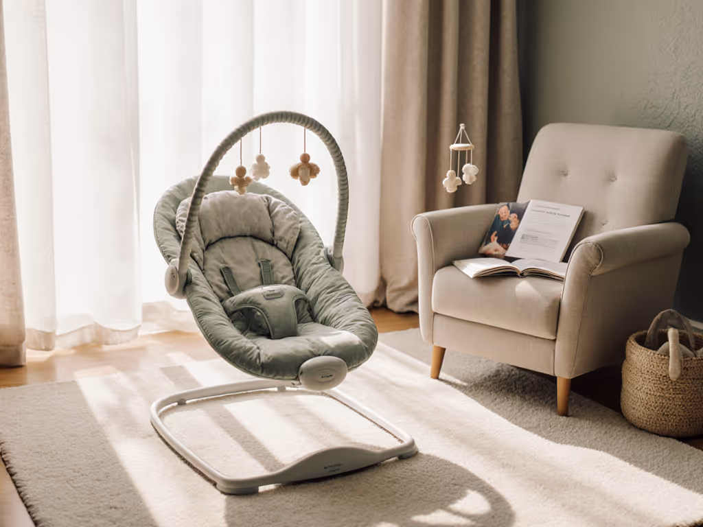 The bouncer must feel like a tool, not an ornament. Choose a neutral fabric color (matte grays, soft whites, taupes) that blends with adult interiors rather than announcing itself with primary colors or cartoon prints. Slim frames and compact footprints in warm woods or muted metals disappear into corner spaces better than bulky plastic forms.[7]