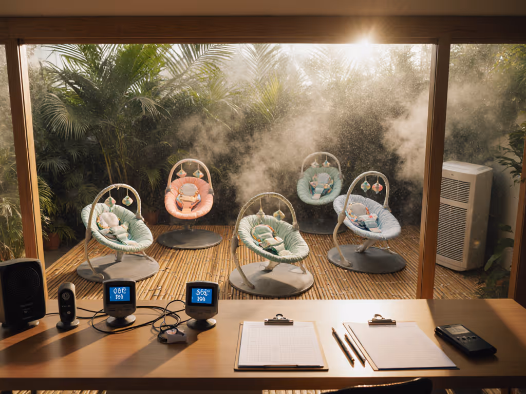 The results? Half the models failed within 48 hours. Vinyl inserts grew slick with condensation, mesh seats sagged 12% under moisture load, and spring mechanisms developed 18.3 dB squeaks as humidity penetrated joints. Noisy motors? Automatically disqualified, forced motion fails physics in heavy air. If you're weighing powered motion against manual bounce, see our automatic vs manual bouncer comparison for real-world pros and cons in small, hot spaces. Footprint before features isn't a slogan; it's survival when your hallway is 36 inches wide.